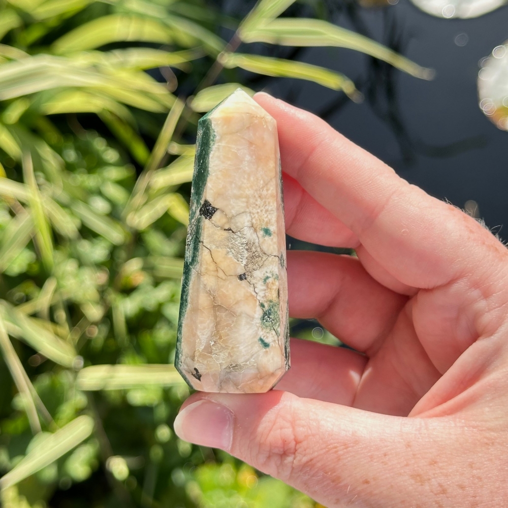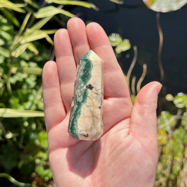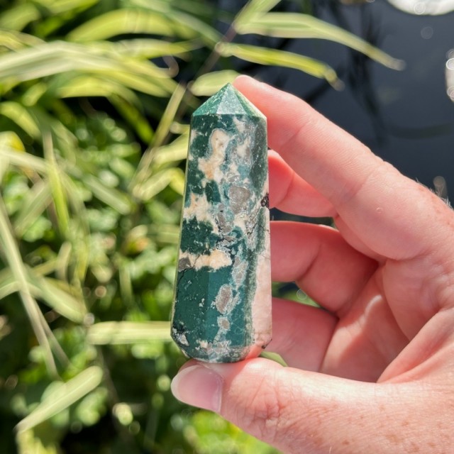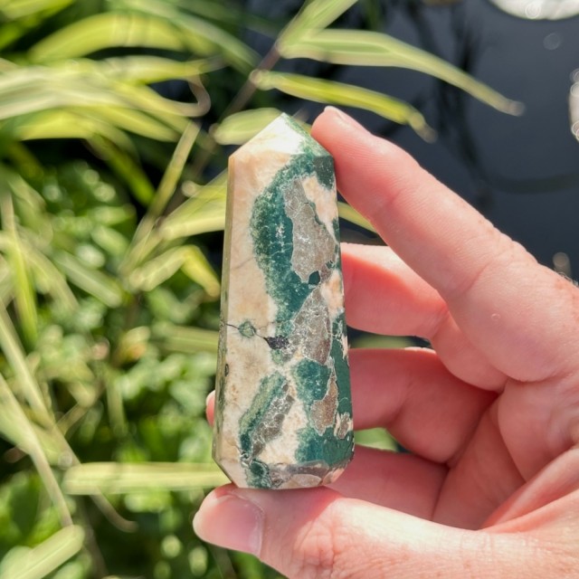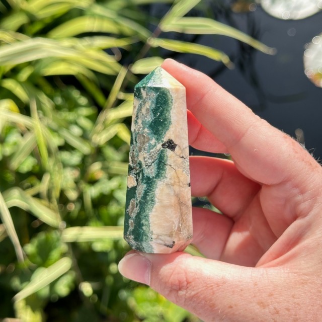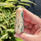 Nydelig kombinasjon av Tre Agat, Heulanditt og Skolesitt. Denne veier ca 63g og er 7,9cm. Det er den krystallen på bildene du får hvis du bestiller denne. Bildene er tatt ute i sollys. OBS: Naturlige merker, hulrom og "cracks" forekommer på disse!