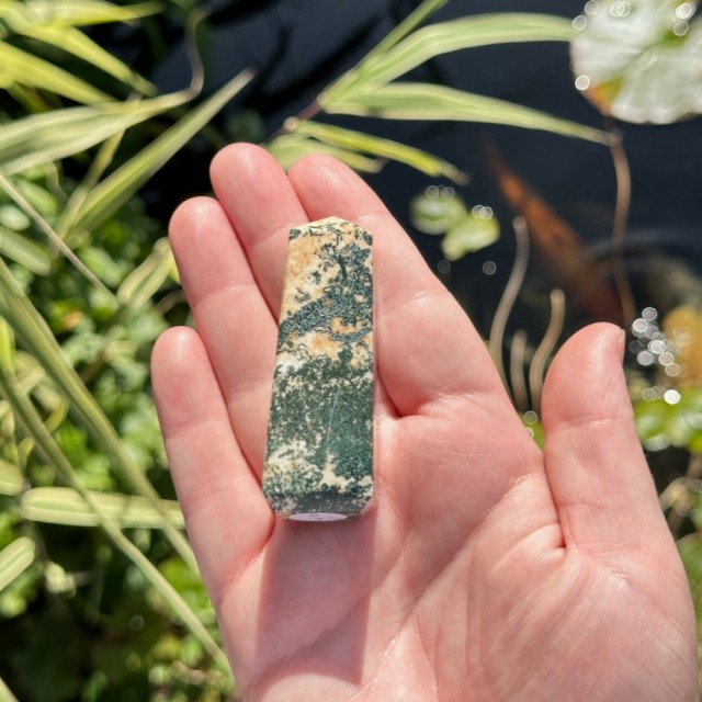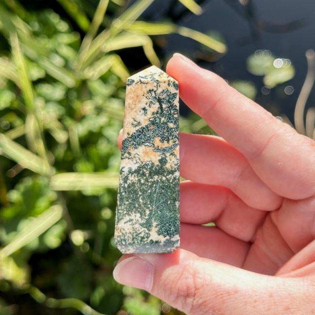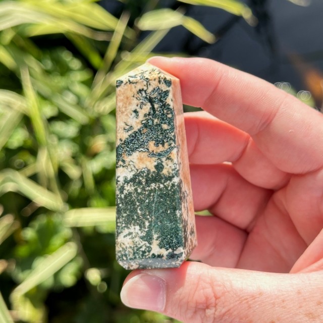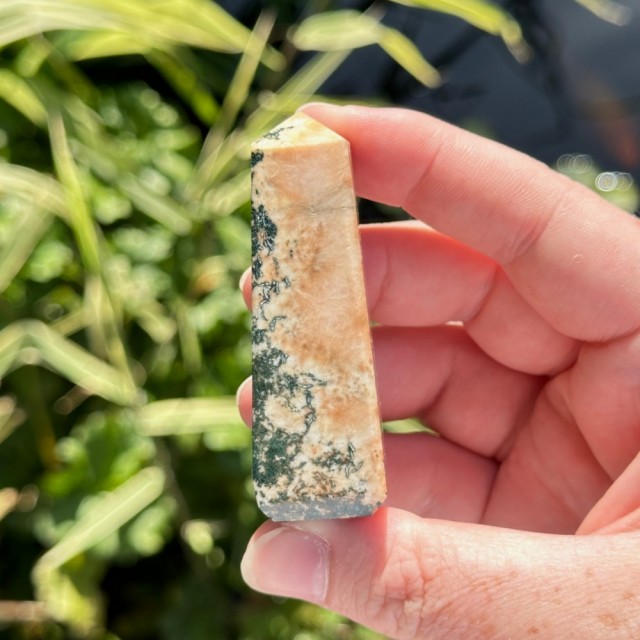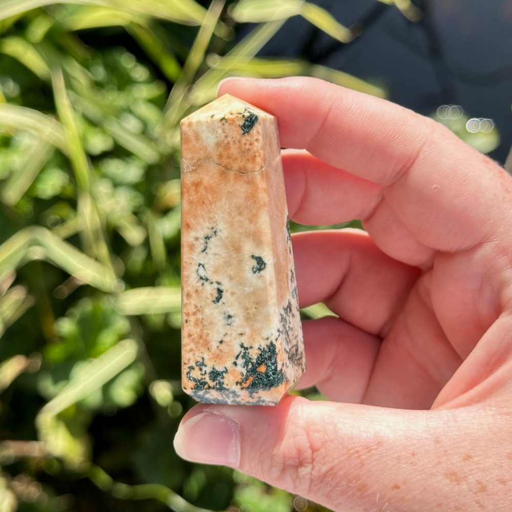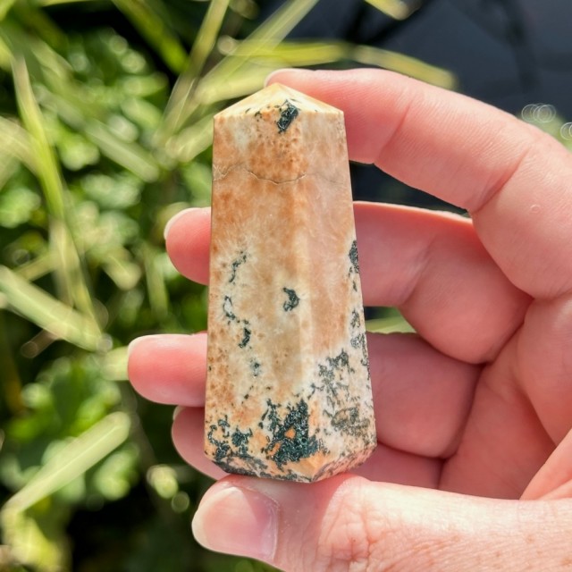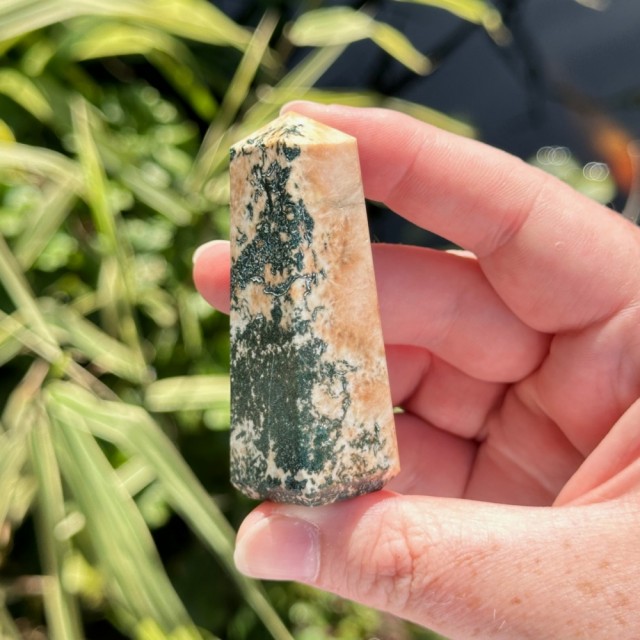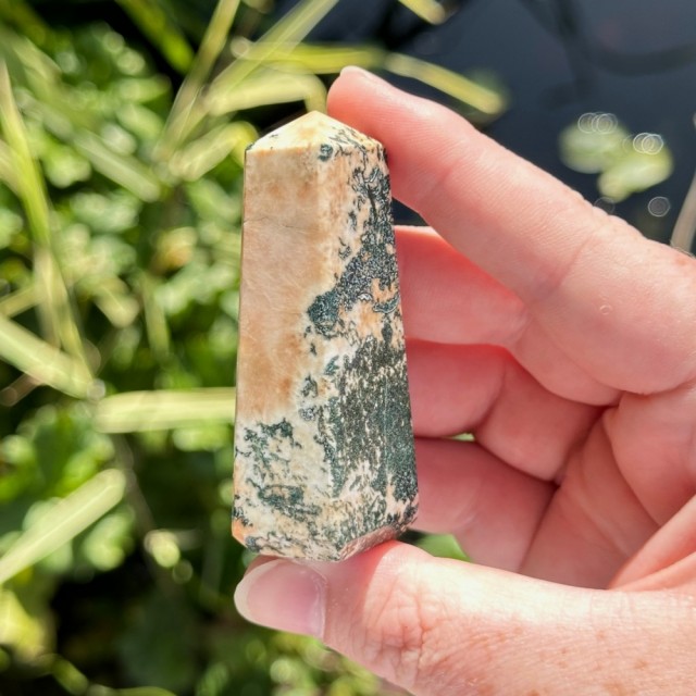 Nydelig kombinasjon av Tre Agat, Heulanditt og Skolesitt. Denne veier ca 48g og er 7cm. Det er den krystallen på bildene du får hvis du bestiller denne. Bildene er tatt ute i sollys. OBS: Naturlige merker, hulrom og "cracks" forekommer på disse!