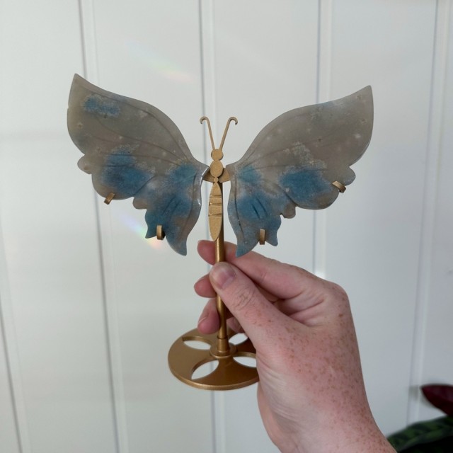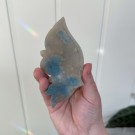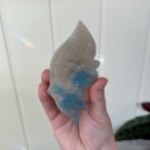 Blå Aragonitt er en beroligende stein som minner om stillheten i havet. Den lindrer stress, styrker kommunikasjon og bringer fred, klarhet og egenkjærlighet. Dette tårnet er 101g og er 9,5cm høyt.