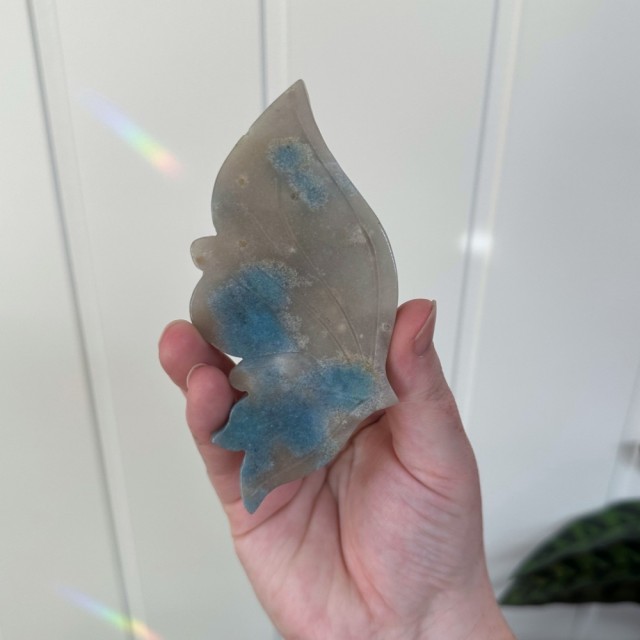 Blå Aragonitt er en beroligende stein som minner om stillheten i havet. Den lindrer stress, styrker kommunikasjon og bringer fred, klarhet og egenkjærlighet. Dette tårnet er 123g og 9,6cm.