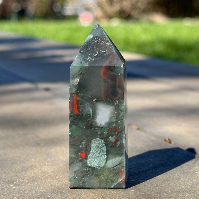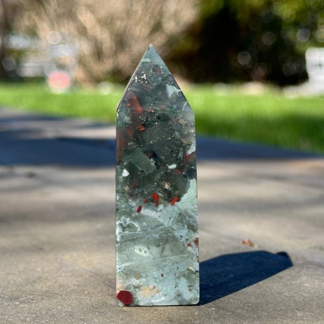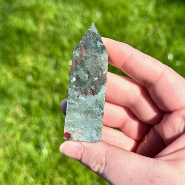 Nydelig Afrikansk Blodstein/Steonitt tårn. Dette er 7,3cm høyt og veier ca 75g. Det er den på bildene du får hvis du bestiller denne. Små merker kan forekomme. OBS: Alle bildene er tatt ute i sollys.