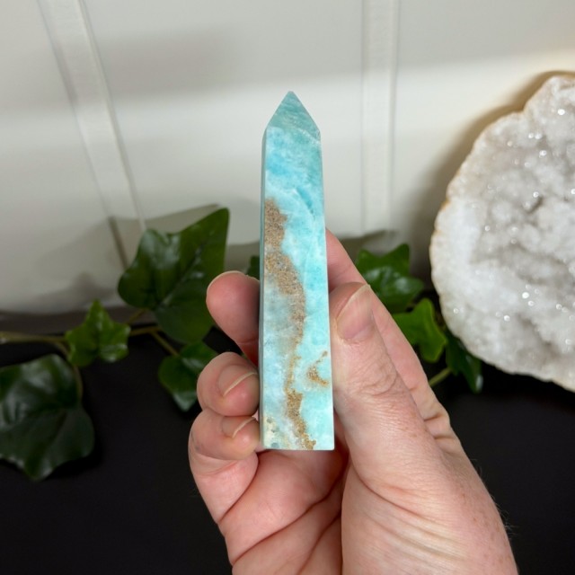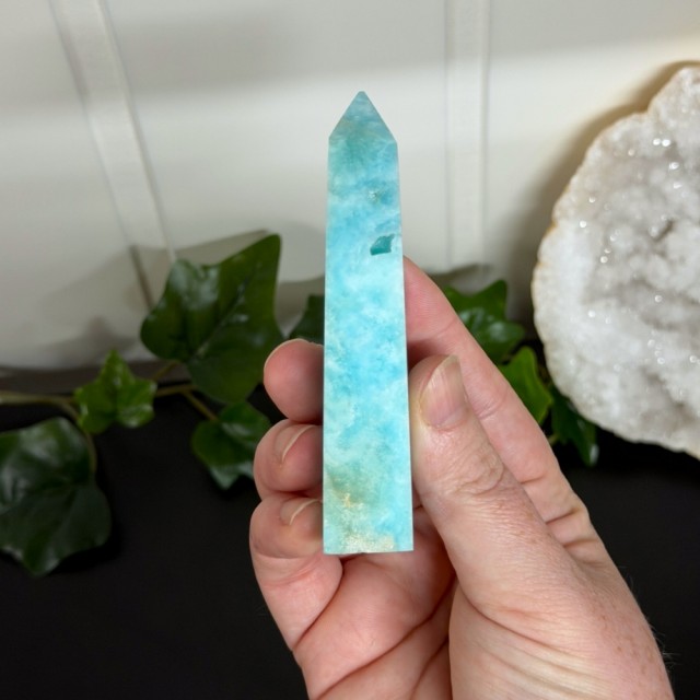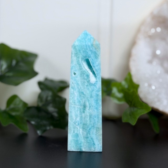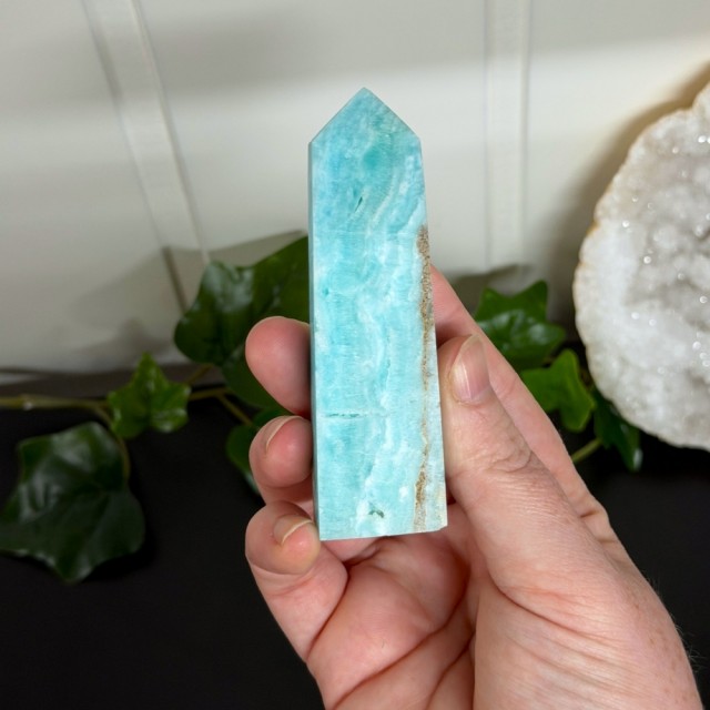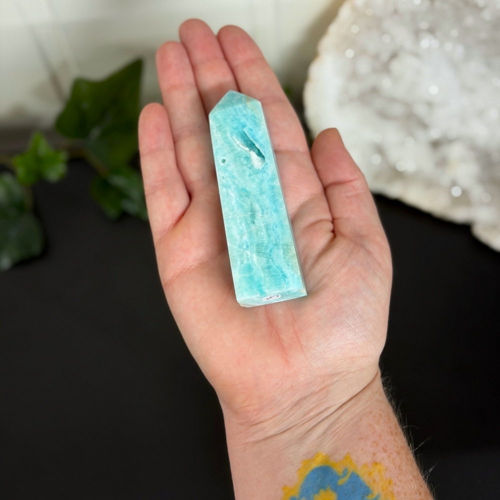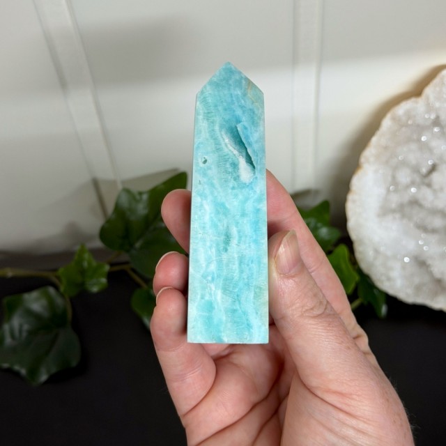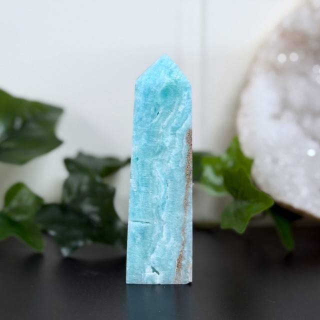 Blå Aragonitt er en beroligende stein som minner om stillheten i havet. Den lindrer stress, styrker kommunikasjon og bringer fred, klarhet og egenkjærlighet. Dette tårnet er 101g og er 9,5cm høyt.