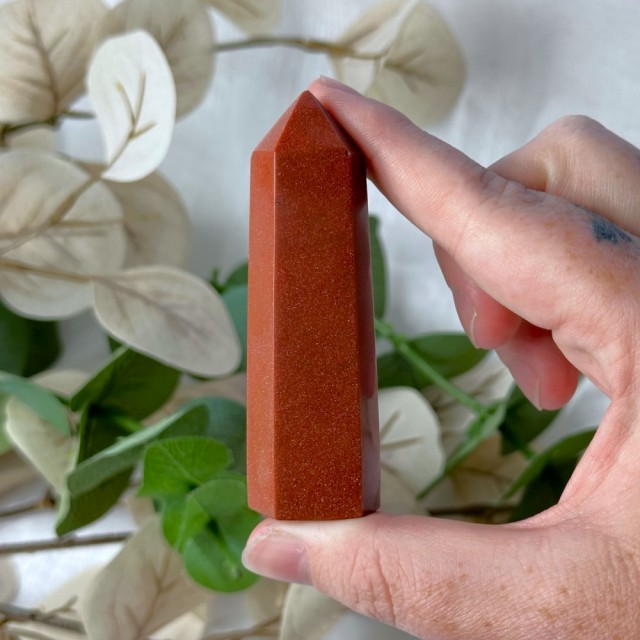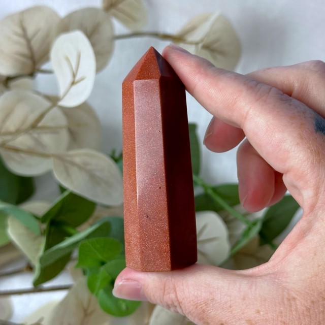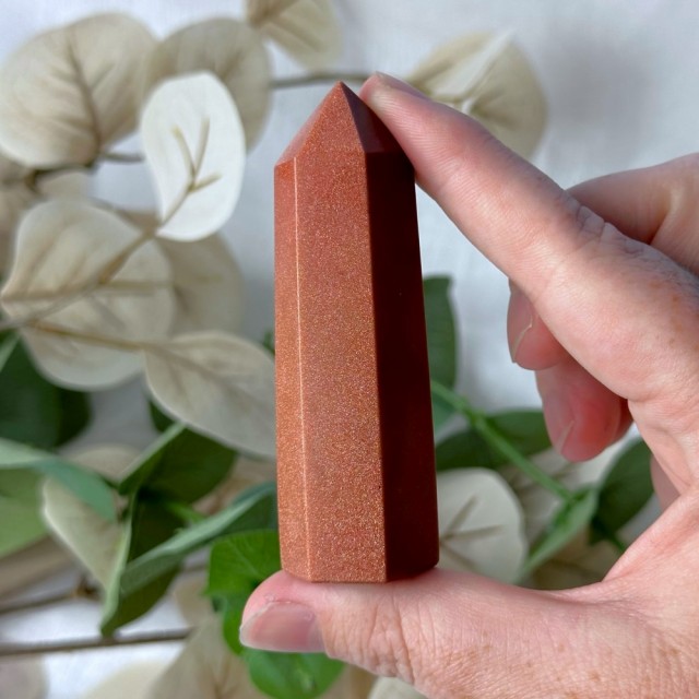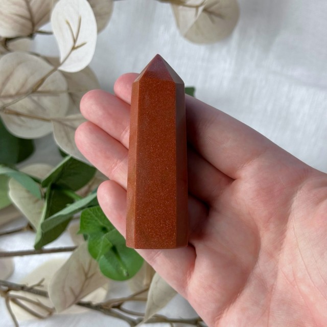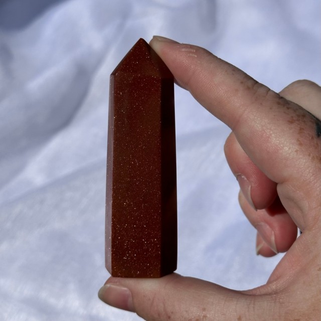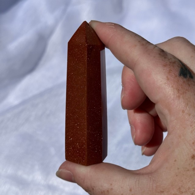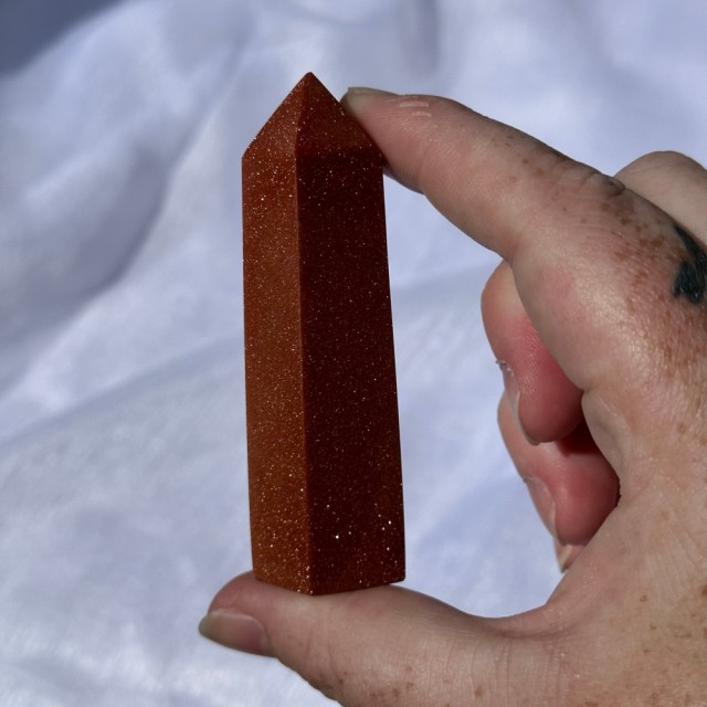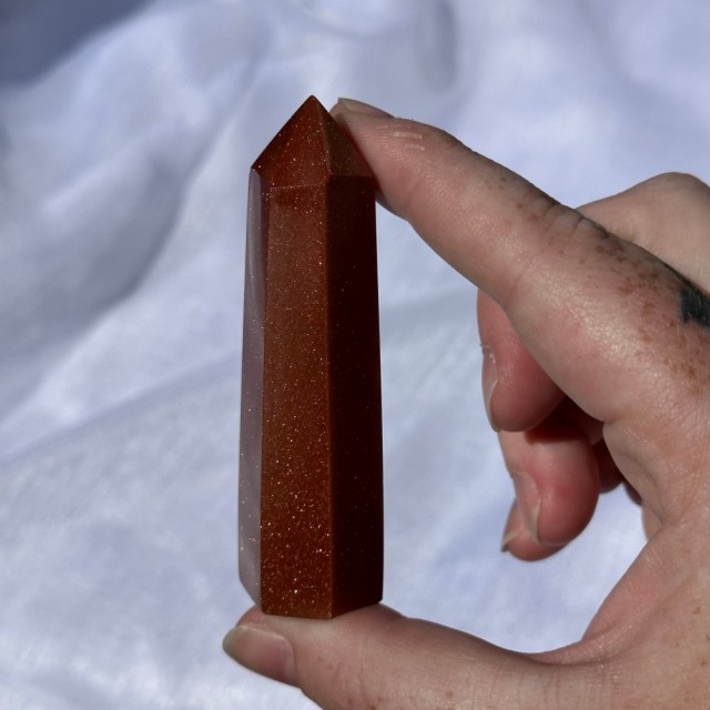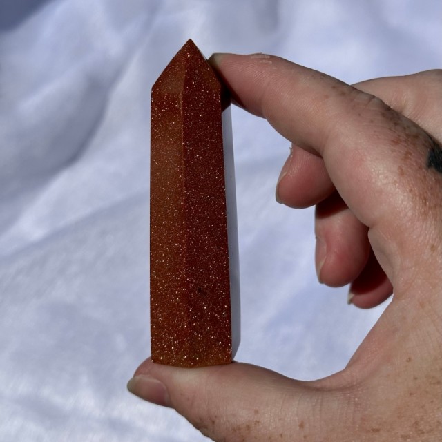 Stjernestein/Sandstone/Goldstone er faktisk en nydelig menneskeskapt stein. Dette tårnet er 8cm og veier 72g. Det er den på bildene du får hvis du bestiller denne. -Små merker kan oppstå.