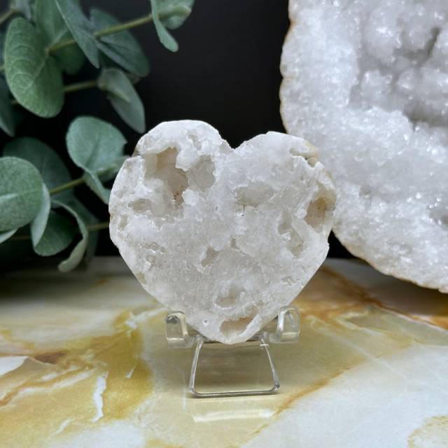 Et hjerte skapt av tid, jord og magi. Denne naturlige agaten med glitrende drusy krystaller bringer ro, klarhet og jordende energi inn i rommet ditt – et symbol på naturens skjønnhet og hjertets indre lys. Små merker forekommer. Stand medfølger ikke.