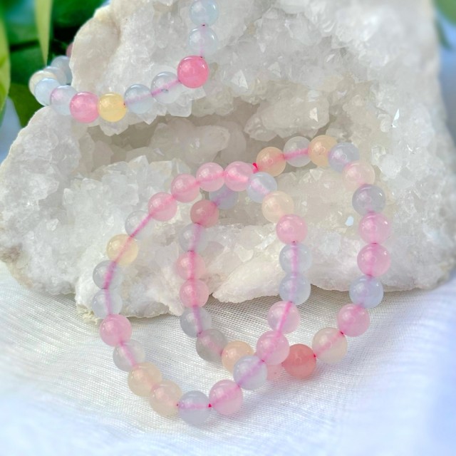 Morganitt Armbånd på 8mm. Dette krystallarmbåndet er det perfekte tilbehøret for å forbedre din aura og bringe positiv energi inn i livet ditt. Passer fint på om du er 17-18cm rundt håndleddet. (er selv 19, da blir de litt stramme). Fargene er fremhevet.