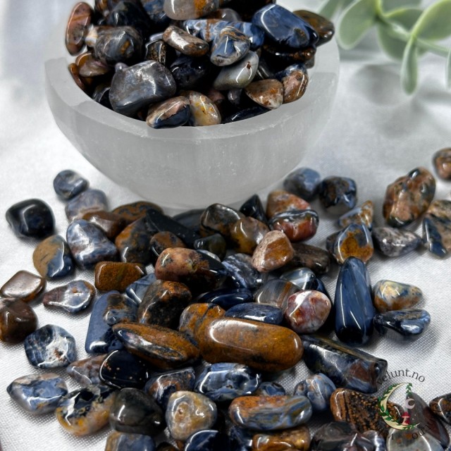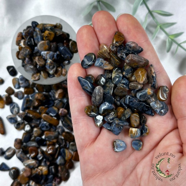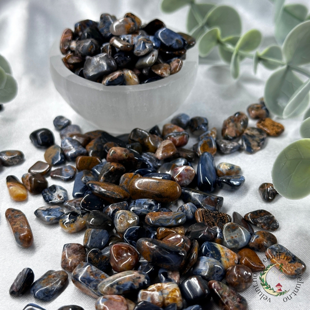 Her har du Tigerøye chips i 30grams pakker. Krystallchips kan brukes til så mangt, foreksempel så kan de brukes som pynt på et fat sammen med andre krystaller eller i en pynteskål. De kan også brukes i egne spellkits/spelljars om du ønsker å lage dette.