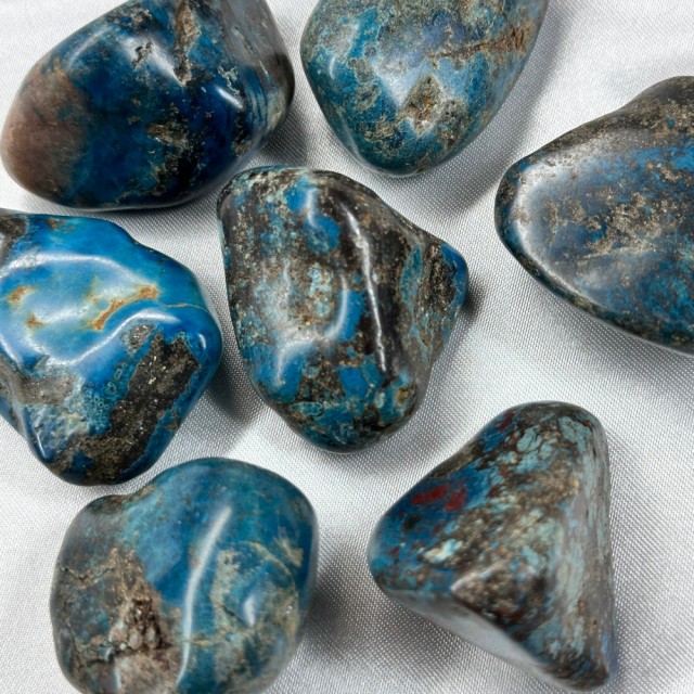 Shattukitt/Shattuckite tromlet stein. Disse er store i størrelsen 3-4cm og de veier ca 25-35g per stk. OBS: Naturlige små merker forekommer.