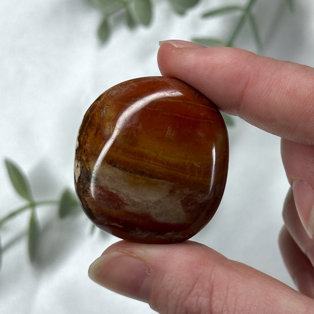 Forsteinet tre er trerester som er beskyttet mot forråtnelse, fordi de ikke utsettes for luft. Disse har vært tilgjengelig nesten siden tidens begynnelse. Denne lommesteinen er 3,7x1,4cm og veier ca 22g. Den er litt mer oransje i fargen enn den viser.