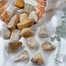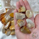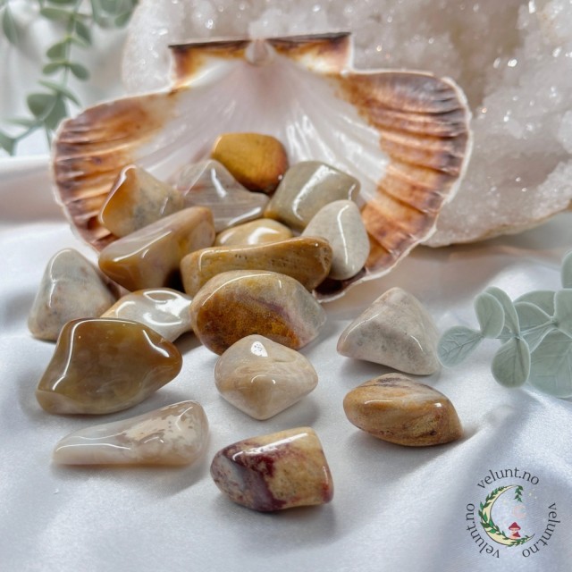 Små Blomster Agat tromlet stein. Disse er 1-2,5cm. Disse selges til redusert pris pga litt lav kvalitet. Naturlige merker forekommer på disse, se bilder før kjøp.