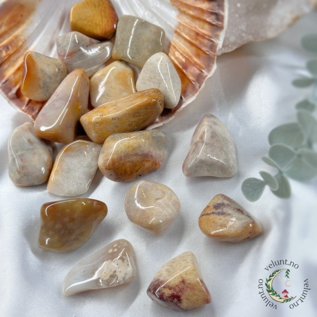 Nydelige Sjø Jaspis (Ocean Jasper) tromlet steiner. Disse kommer i forskjellige fargenyanser og er ca 1,5-3cm. Tilfeldig plukket.