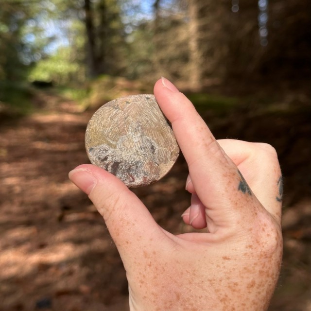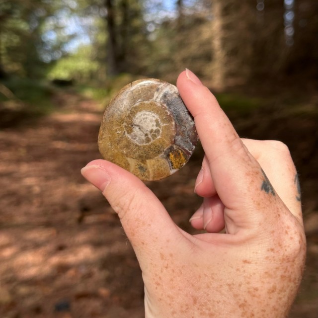Dette spiralformede fossilet er en Goniatitt fra devontiden og er ca 251 til 390 millioner år gammelt.