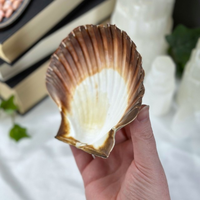 Et ekte kamskjell fra Tysvær, Norge – for deg som ønsker å bringe havets magi inn i hjemmet ditt. Perfekt til smykker, røkelse eller alterdekor. Disse er plukket fra Tysvær i Norge. Størrelsen er ca 13,9x12,3cm. **OBS: Litt knekt oppe, redusert pris.