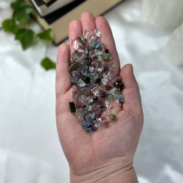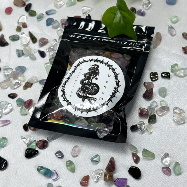 ♥Regnbue Turmalin ♥Bergkrystall ♥Regnbue Fluoritt. I denne posen får du alle disse krystallene mikset sammen til nydelig blanding. Du kan dekorere med disse i hjemmet ditt eller bruke i hekse-spells. Hver pose inneholder 50g krystallchips miks.