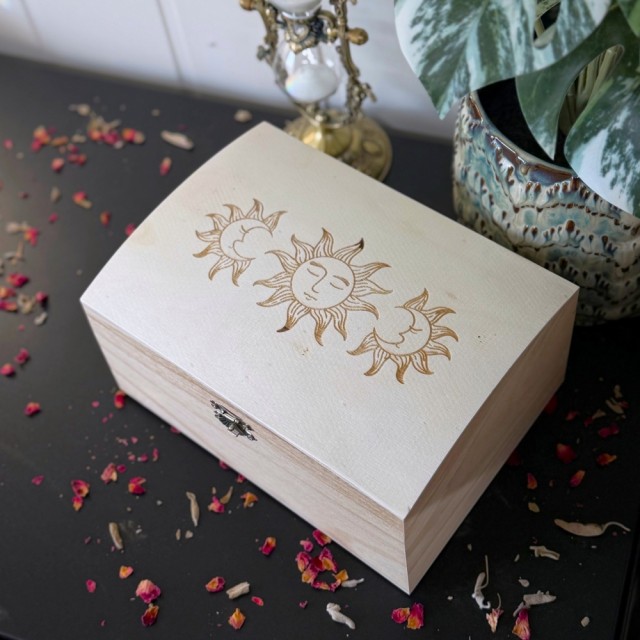 Den romslige trekisten gir en solid og eksklusiv følelse. Den kan brukes videre til oppbevaring av krystaller, ritualredskaper eller personlige skatter. En kiste som er ment å vare i mange år. Gravert med sol fase på toppen av kisten.