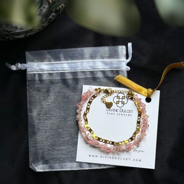 Super elegant armbånd laget med naturlige jordbærkvarts krystallbiter og 24 karat gullbelagt flatlenkekjede i rustfritt stål. Dette jordbærkvarts armbåndet er den perfekte kombinasjonen av eleganse, harmoni og kjærlighet.
