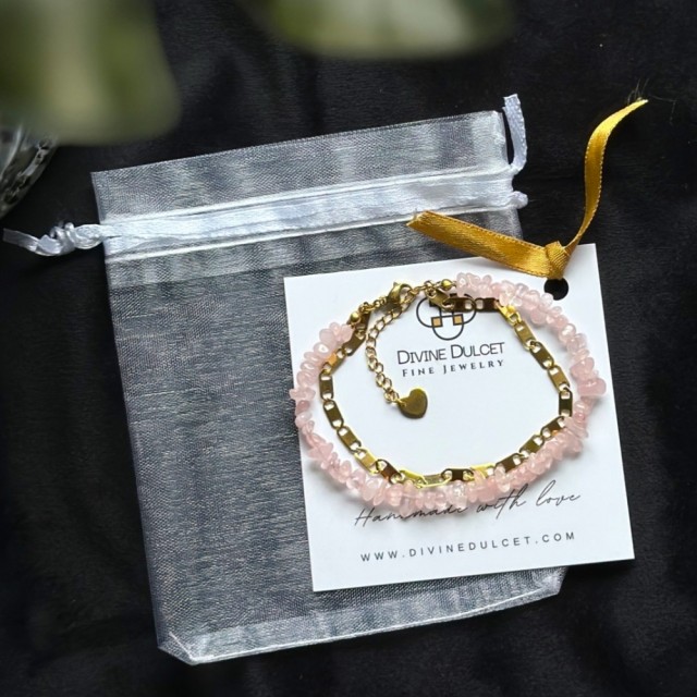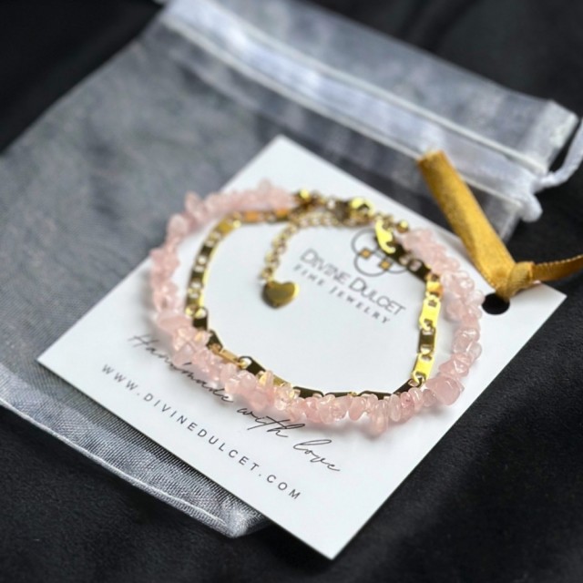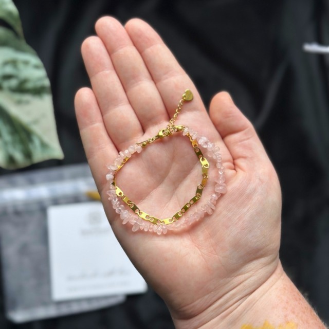Super elegant armbånd laget med naturlige rosenkvartskrystallbiter og 24 karat gullbelagt flatlenkekjede i rustfritt stål. Dette rosenkvartsarmbåndet er den perfekte kombinasjonen av eleganse og selv-kjærlighet.