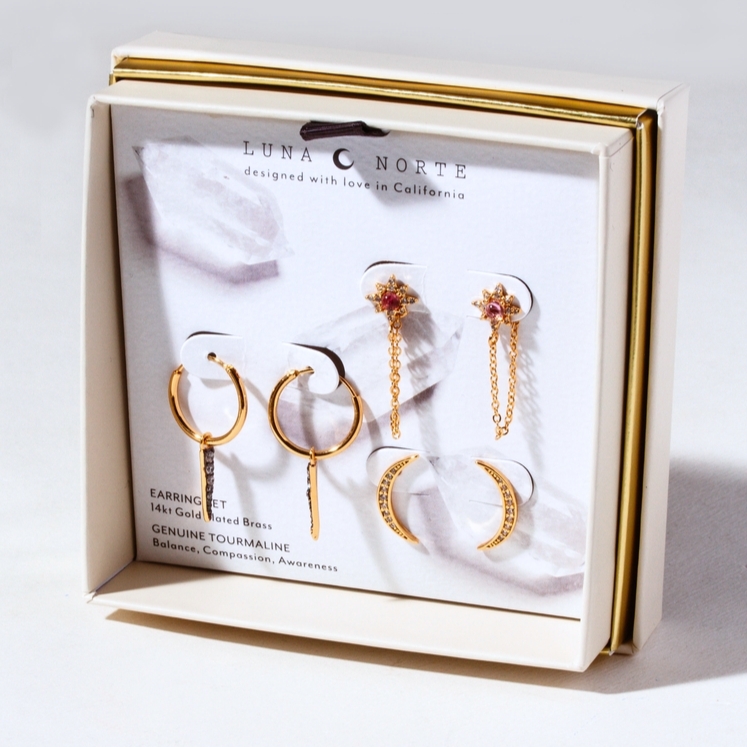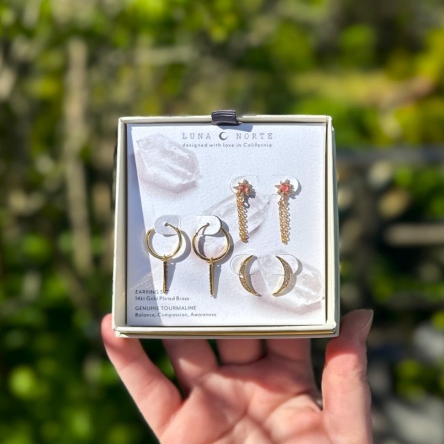 Dette øredobbsettet er et allsidig must-have, designet for deg som elsker elegante, himmelsk inspirerte smykker. Denne trioen har en perfekt blanding av moderne eleganse og kosmisk sjarm og er laget i 14KT gullbelegg. Hvert par er utsmykket med CZ-steiner, mens stjerne- og kjedeøredobbene er fremhevet med en turmalinstein for et subtilt fargeinnslag.
