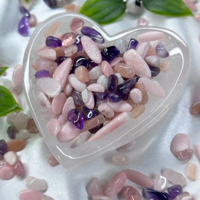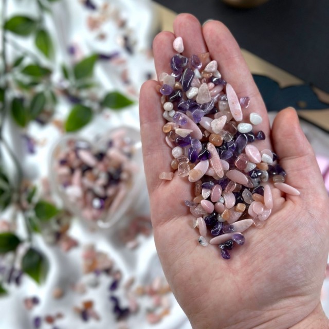 I denne nydelige magiske krystallchips miksen kan du finne Ametyst, Rosa Opal & tørkede Roseblader. Disse pakkene kommer med 50g krystaller mikset sammen, tilfeldig plukket. Prisen er per stk.