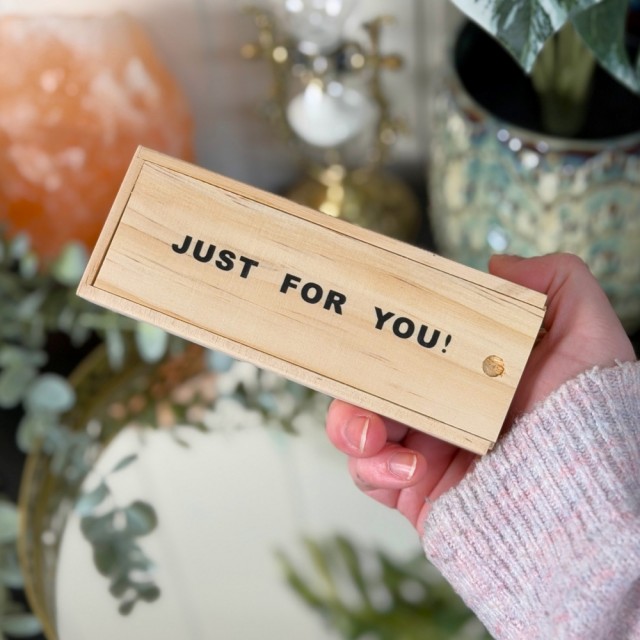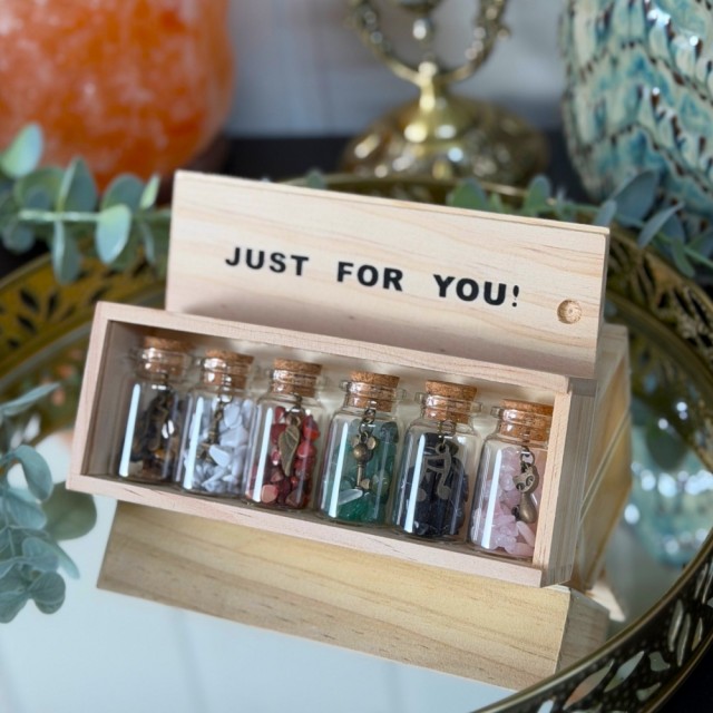 Denne nydelige treboksen inneholder 6 små glassflasker med kork, hver fylt med ekte krystallchips og en tilfeldig utvalgt charm. På lokket står teksten “Just For You!” og det er akkurat slik den føles.