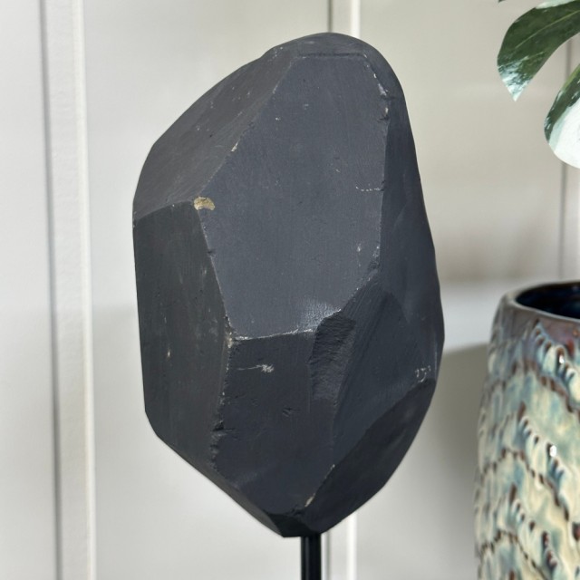 Denne nydelige Ametystgeoden i mørk lilla er et ekte blikkfang. Montert på et solid metallstativ, fremheves de naturlige krystallformasjonene på en sofistikert måte. Hver geode er unik, med sitt eget mønster og glitrende krystallstruktur, noe som gjør den til et eksklusivt innslag i enhver innredning.