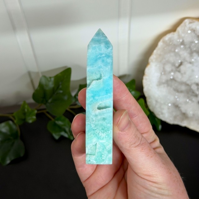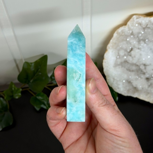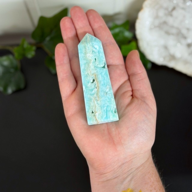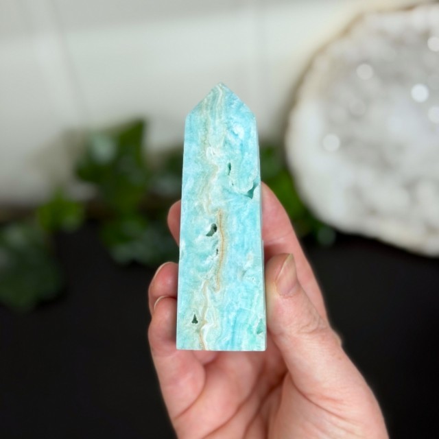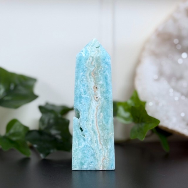 Blå Aragonitt er en beroligende stein som minner om stillheten i havet. Den lindrer stress, styrker kommunikasjon og bringer fred, klarhet og egenkjærlighet. Dette tårnet er 123g og 9,6cm.