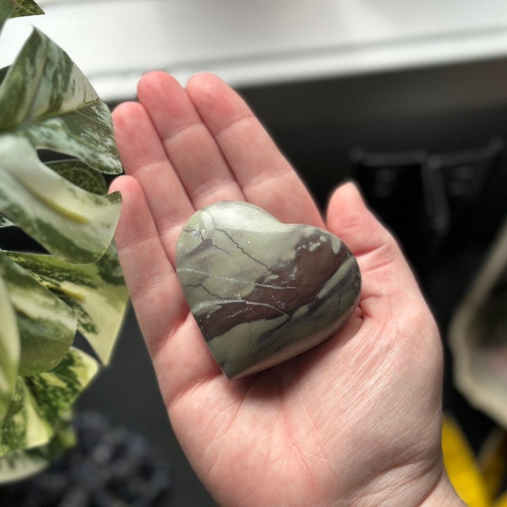 Candy Jaspis, en grønn og brun Jaspis fra Pakistan. Det hvite på krystallen er kvarts inneslutninger. Dette hjertet er 6,4x5,6x2,8cm og veier ca 133g.