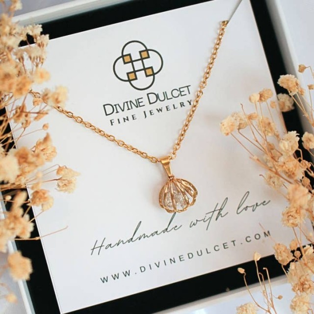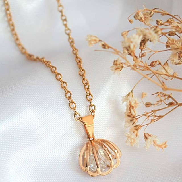 Dette søte skjellkjedet er laget av 24 karat gullbelagt kobber med små zirkonia-steiner innlagt i ringen.