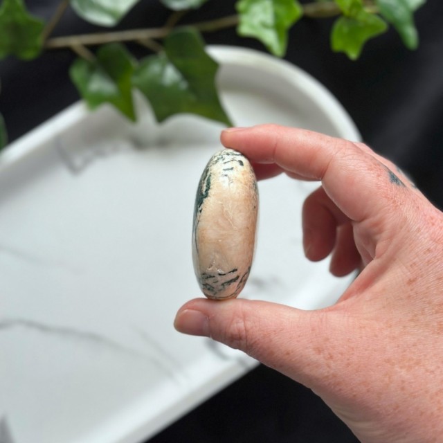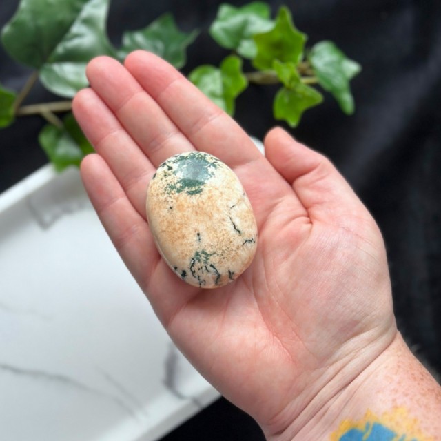 -Tre Agat, en jordnær form for grønnlig hvit agat, med mønstre som minner om moser eller røtter - derav navnet.