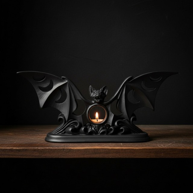 Symbolikken med månefaser representerer livets evige syklus, intuisjon og transformasjon - og sammen med flaggermusens kraftfulle vesen blir dette et stykke gotisk kunst med dyp mening. Perfekt til ritualer, meditasjon, eller som et dramatisk dekorstykke på alteret eller i hjemmet.