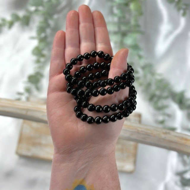 Svart Obsidian armbånd (8mm, ca. 16-17cm) er en kraftfull beskyttelsesstein. Den skjermer mot negativ energi, jorder og gir indre styrke - en kraftig beskyttende amulett for klarhet og trygghet.