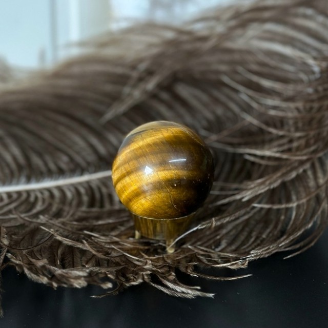 En nydelig liten gullskinnende Tigerøye kule på 4,1cm og ca. 98g - et glødende symbol på styrke, mot og selvsikkerhet. Med sitt hypnotiske skinn beskytter den mot negativitet, balanserer energi og bringer et snev av ren solmagi inn i ditt hjem.