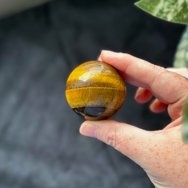 En nydelig liten gullskinnende Tigerøye kule på 4,6cm og ca. 140g - et glødende symbol på styrke, mot og selvsikkerhet. Med sitt hypnotiske skinn beskytter den mot negativitet, balanserer energi og bringer et snev av ren solmagi inn i ditt hjem.