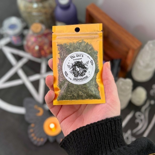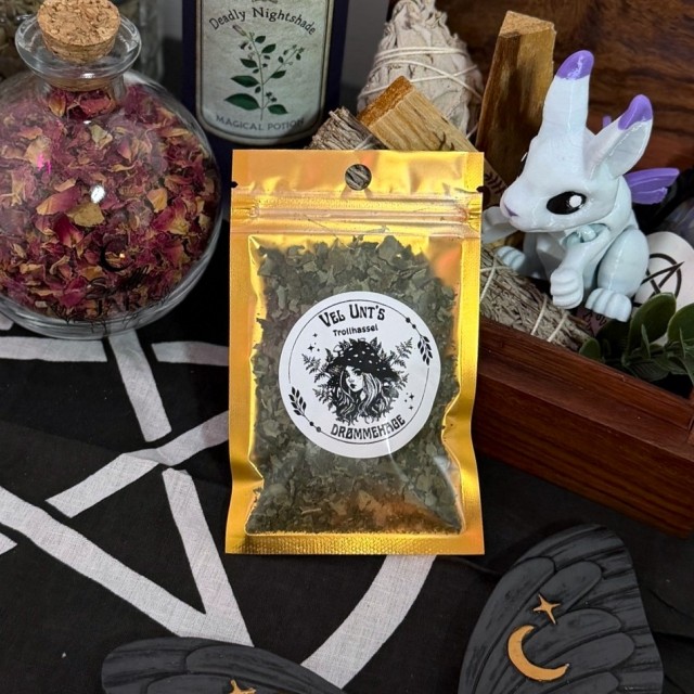 Disse trollhasselbladene er høstet med respekt for plantens naturlige syklus og tørket skånsomt for å bevare både struktur og energi. Bladene bærer en rolig, stabil og samlende kraft - ideell for subtilt, men dypt rituelt arbeid.