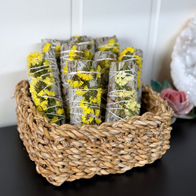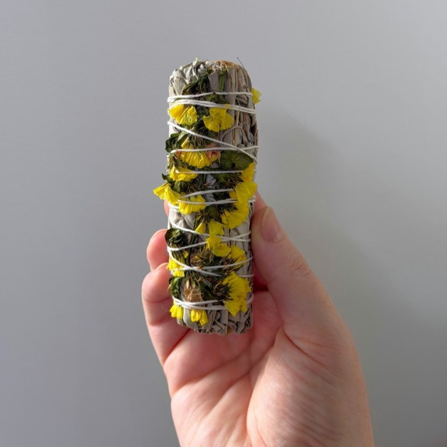 Denne renselsesbunten kombinerer den rene, beskyttende kraften i Hvit Salvie med den varme, solfylte energien i Gul Sinuata. Sammen skaper de en renselse som ikke bare fjerner tung energi, men også fyller rommet med lys, liv og bevegelse.