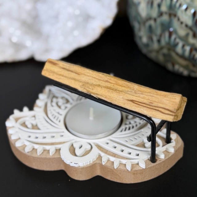 Holderen er designet spesielt for palo santo, med et metallstativ som holder pinnen stabilt mens den brenner. I midten finner du plass til et telys, som gir et ekstra mykt lys og forsterker stemningen ytterligere.