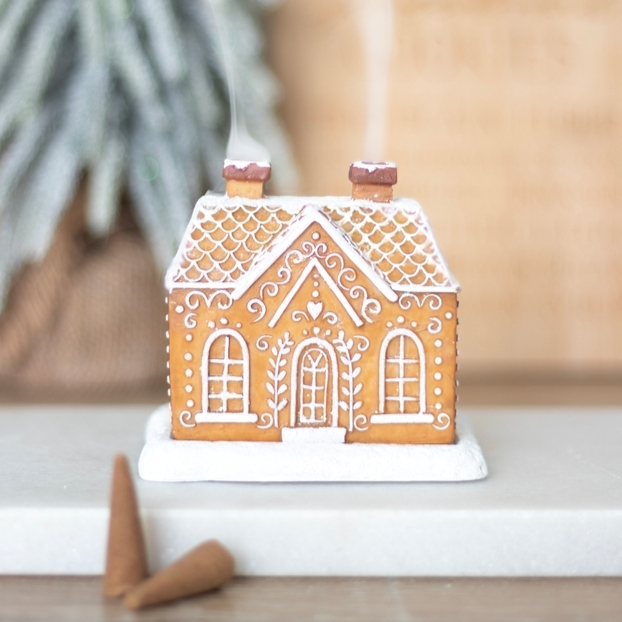 Christmas Gingerbread House/Pepperkakehus til røkelseskjegler. Denne festlige røkelseskjeglebrenneren kommer i form av et snødekket pepperkakehus. Plasser en røkelseskjegle under huset og se hvordan røyken dukker opp fra to søte små skorsteiner.