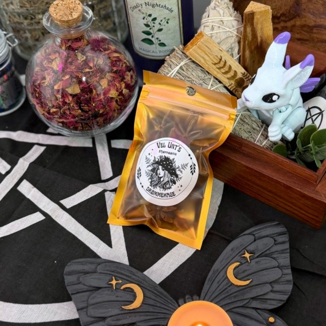 Stjerneanis er en kraftfull og symboltung plante med røtter i asiatisk tradisjon, særlig fra Sør-Kina og Nord-Vietnam. Med sin karakteristiske stjerneform har den i århundrer vært brukt i både rituelle og spirituelle sammenhenger som et symbol på veiledning, beskyttelse og kosmisk orden. Formen alene har gjort den til en favoritt i magisk arbeid knyttet til skjebne, retning og balanse.