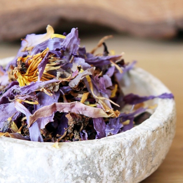 Blå lotus harmonerer vakkert med hvit lotus for renhet, rød lotus for transformasjon, lavendel for ro og roseblader for hjertebalanse.