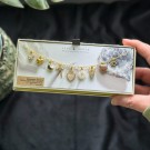 Antall perler vil varere fra smykke til smykke (rundt 5-7 perler, tilfeldig plukk). Smykket kommer i en organza pose (farge vil variere hva som er på lager). Dette glamorøse men søte halskjede kommer med et lite hjerte gravert "Vel Unt" på seg.
