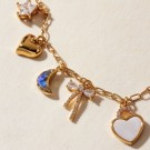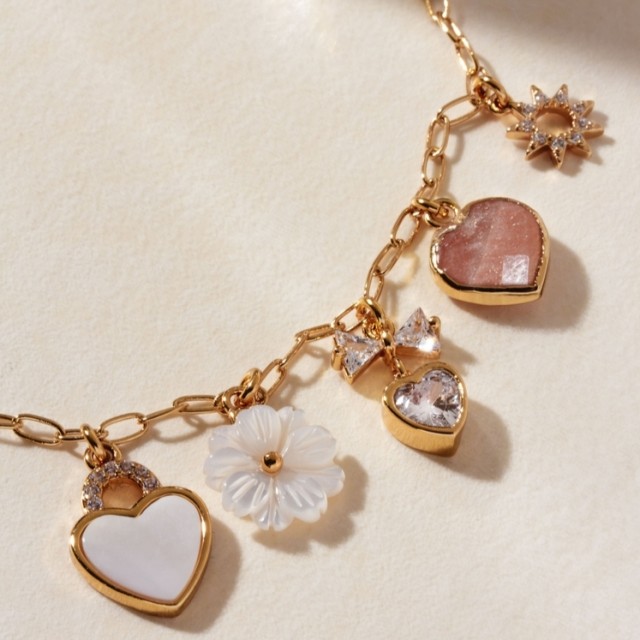 Jordens hjerteslag-anhengsarmbånd har fem unike anheng som henger fra et tykt kjede armbånd. Håndplukket edensteiner – Smaragd, Rubin, Abalone Skjell & Perlemor – er vist frem i ikoniske former.