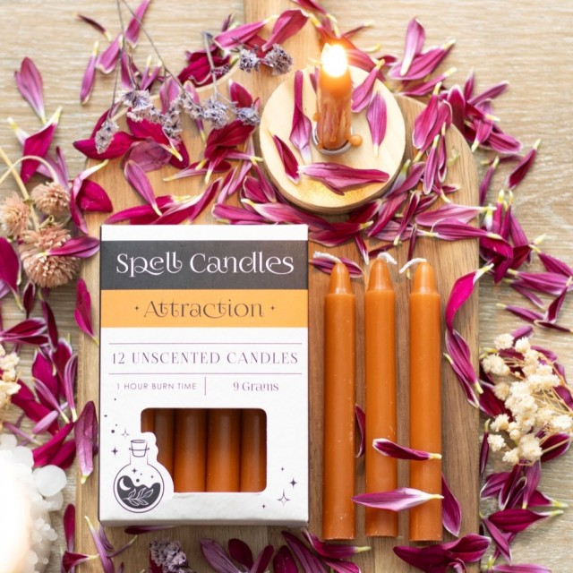 Pakke med 12 oransje stavelys for bruk med ritualer for tiltrekning og positive forandringer.