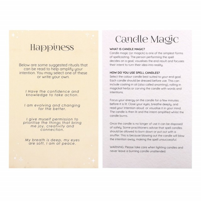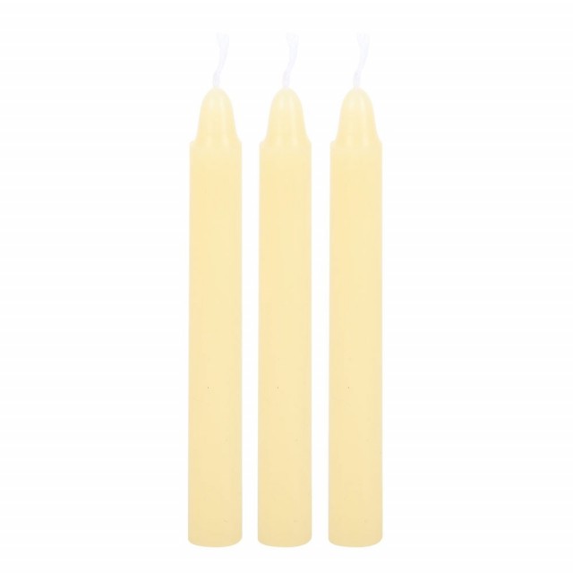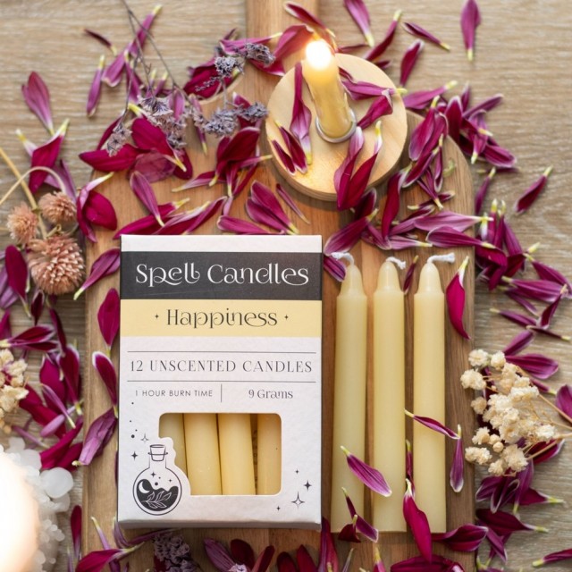 Pakke med 12 lyse gule stavelys for bruk med ritualer for å tiltrekke lykke og positivitet.