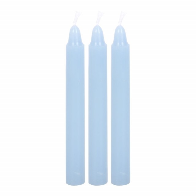 Pakke med 12 lyseblå stavelys for bruk med ritualer for å tiltrekke harmoni og balanse.