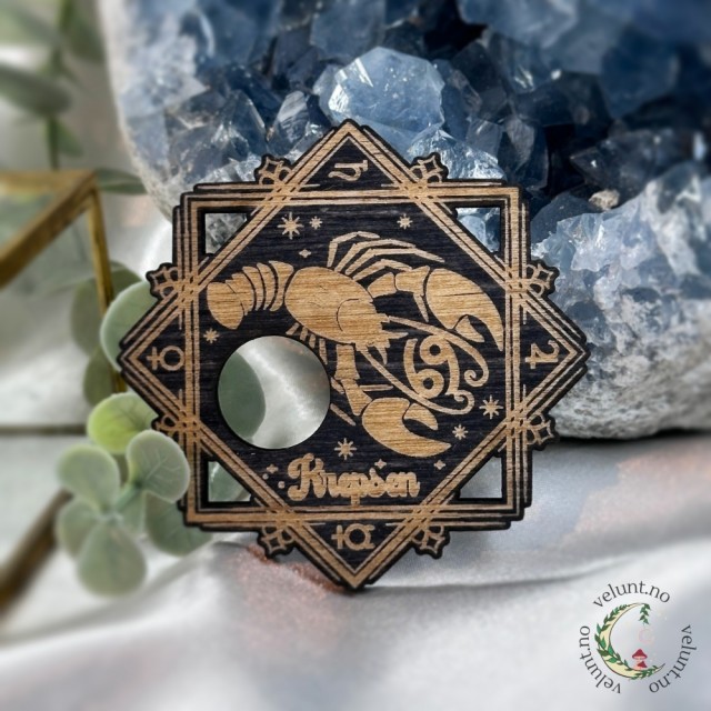 Stjernetegn krystallholder i tre, ca. 7 cm bred. Perfekt for krystallkuler på 2-3 cm. En magisk base for astrologiske ritualer, alterarbeid eller dekorasjon. Designet og produsert med kjærlighet av Vel Unt.