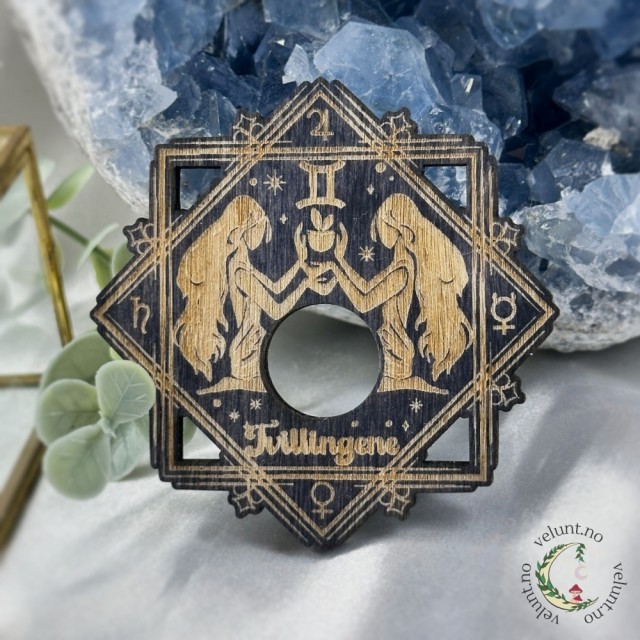 Stjernetegn krystallholder i tre, ca. 7 cm bred. Perfekt for krystallkuler på 2-3 cm. En magisk base for astrologiske ritualer, alterarbeid eller dekorasjon. Designet og produsert med kjærlighet av Vel Unt.