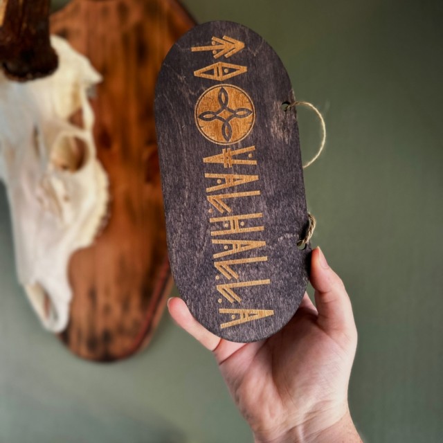 Dette veggskiltet med teksten "TO VALHALLA" er produsert av velunt.no i Norge. Dette har målene 22,3x10,2x0,4cm.